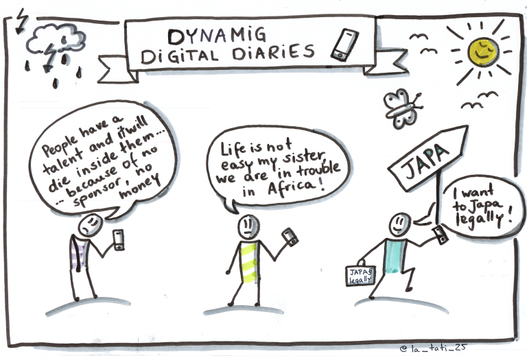 For the DYNAMIG project, I have been using digital diaries as a creative, participatory method to explore how migration decisions are made. Based at Middlesex University London, I followed aspiring migrants, migrants in transit and refugees in Kenya, Nigeria and Morocco – not by being physically present, but through audio, video and text diary submissions via WhatsApp.